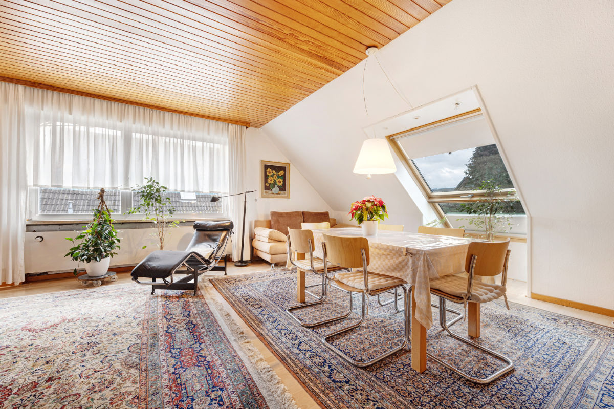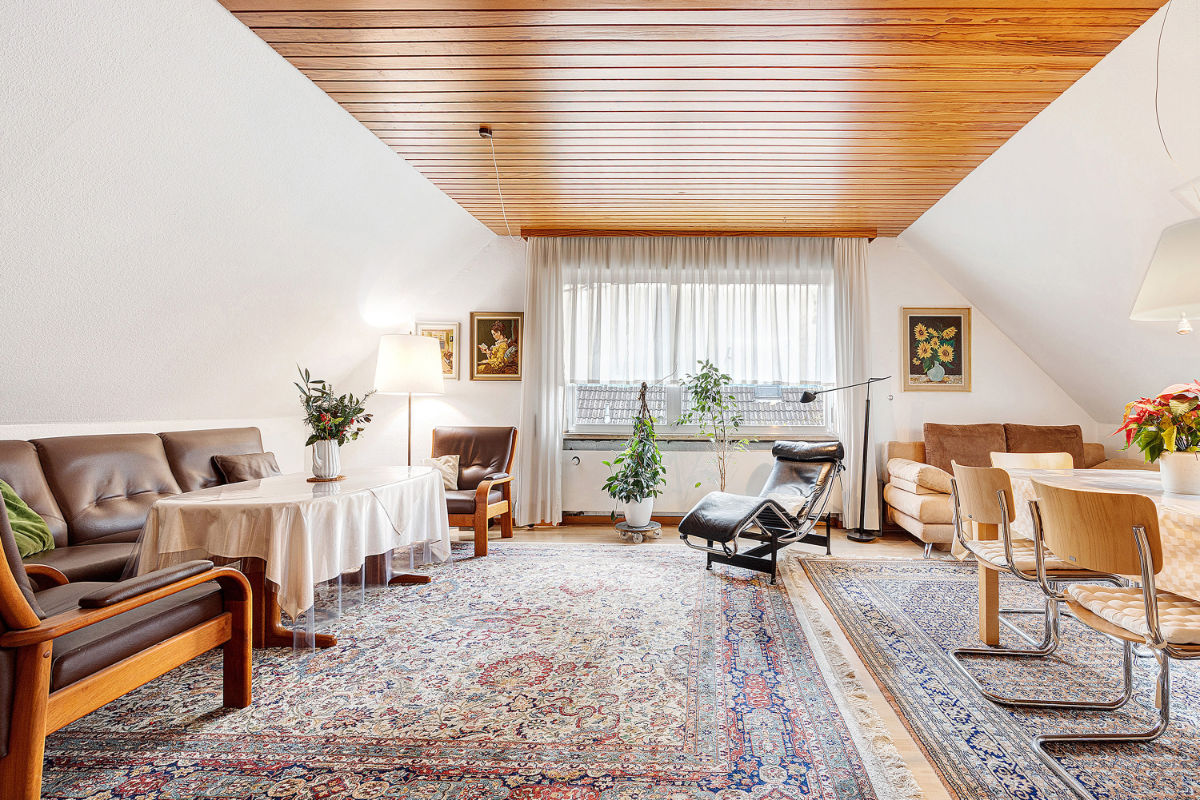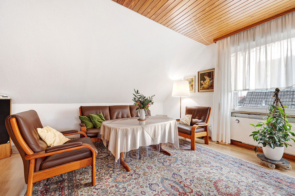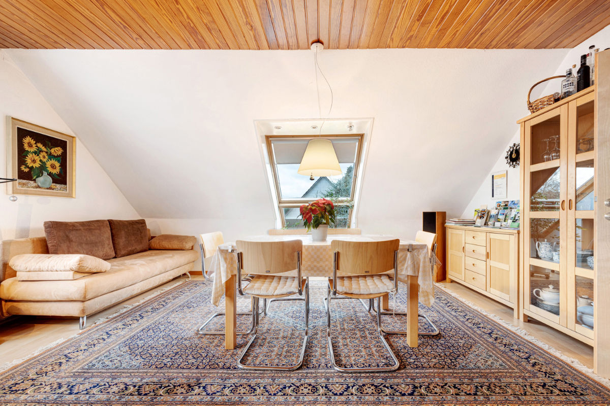 Das Wohnzimmer, 45m2, ist mit Wohn- und Essgruppe für bis zu 8 Personen, sowie mit einer Doppelbettcouch ausgestattet.